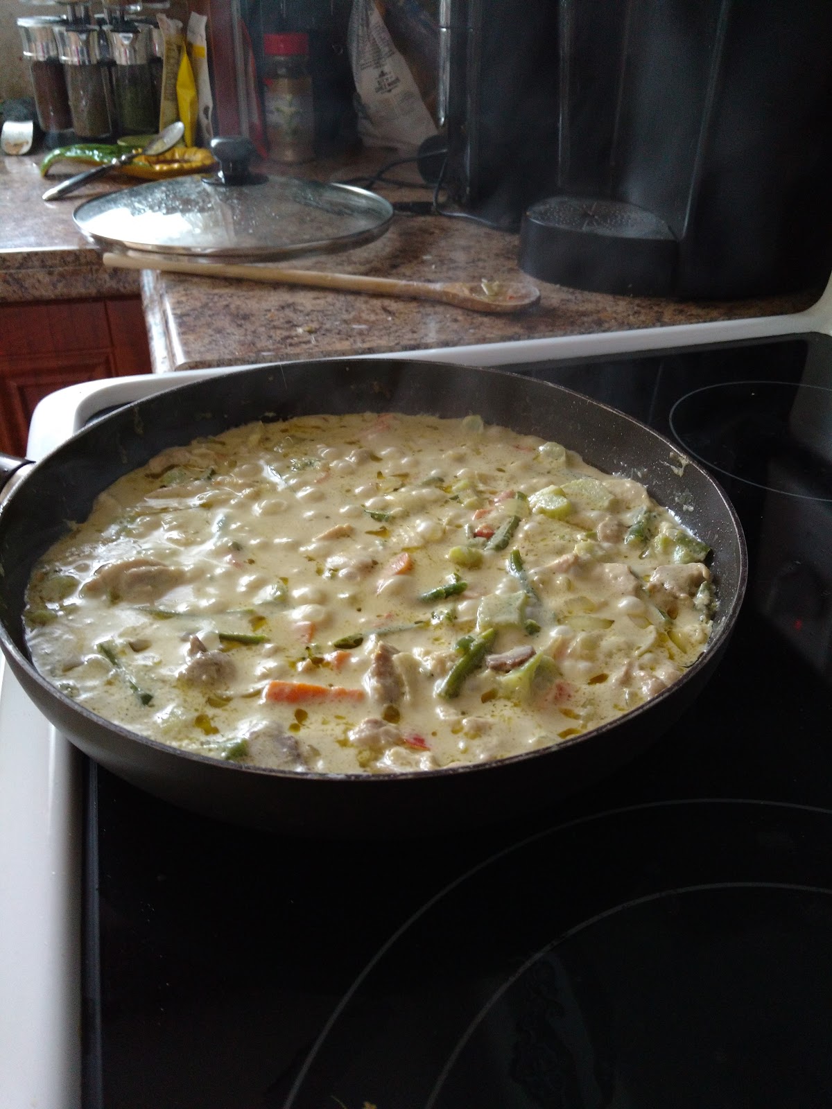 - Add the rest of the coconut milk and then add the defrosted or fresh vegetables.